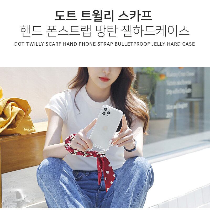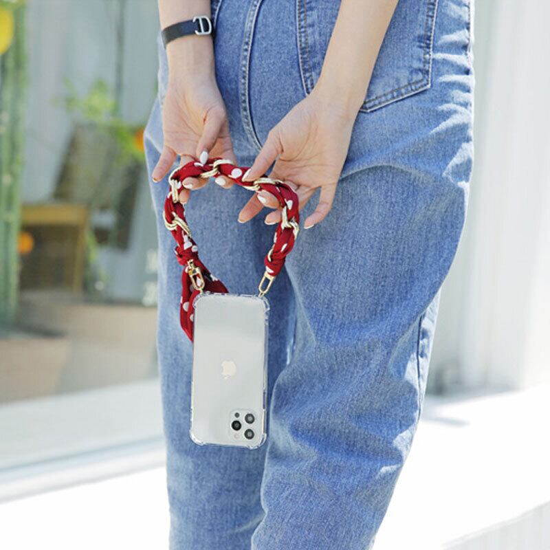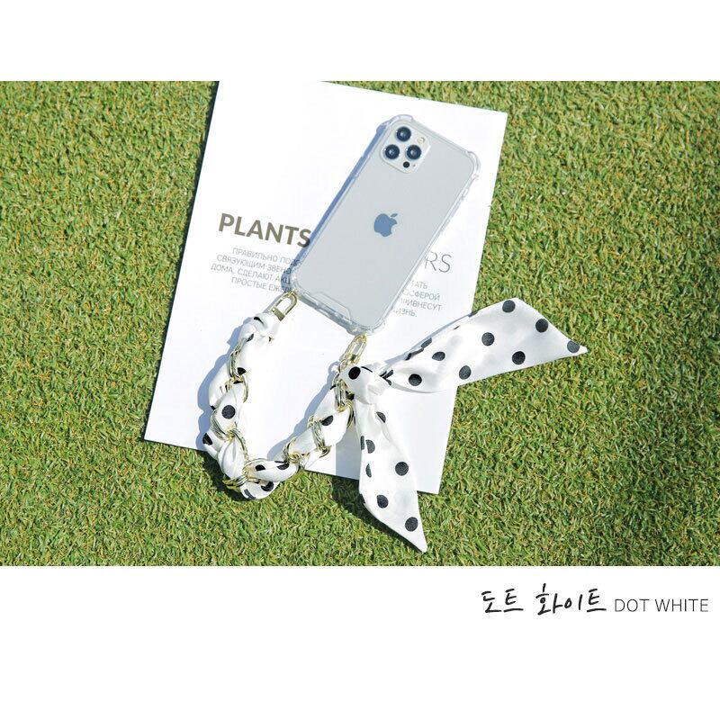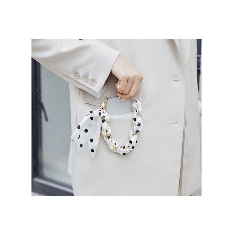 iPhone15/15Plus/15Pro/15ProMax スカーフ ドット チェーン ハンド ストラップ 耐衝撃 透明 クリアケース エレガンス 高見え【STI-756/P0000FXJ】