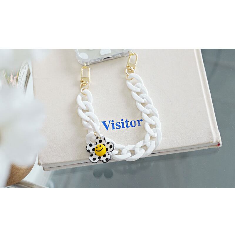 iPhone15/15Plus/15Pro/15ProMax ハンド ストラップ 耐衝撃 透明 クリアケース モノトーン ハンドチェーン ドット 水玉 チェック スマイル フラワー【STI-1078/P0000ICO】